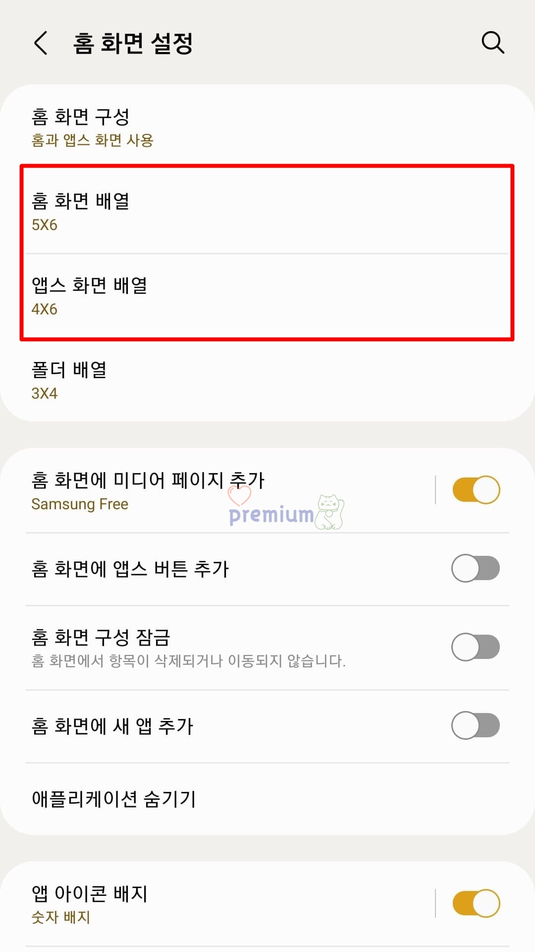 3. 홈 화면 배열과 앱스 화면 배열을 선택합니다.