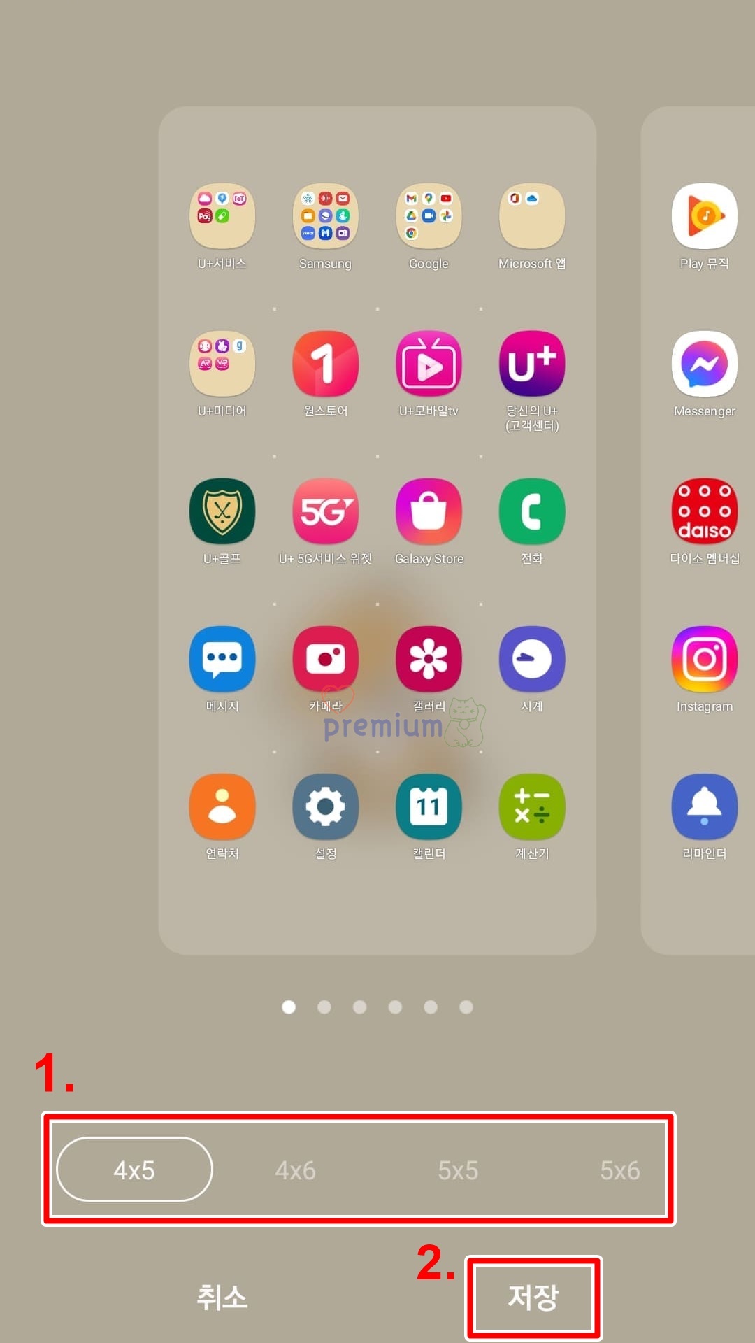 4X5, 4X6, 5X5, 5X6 중 원하시는 크기를 선택하시면 됩니다. 배열의 가로 숫자와 세로 숫자가 높을수록 아이콘 크기는 작아집니다. 만약에 아이콘 크기를 크게 원하시는 분들은 4X5, 작게 원하시는 분들은 5X6을 사용하시면 됩니다.