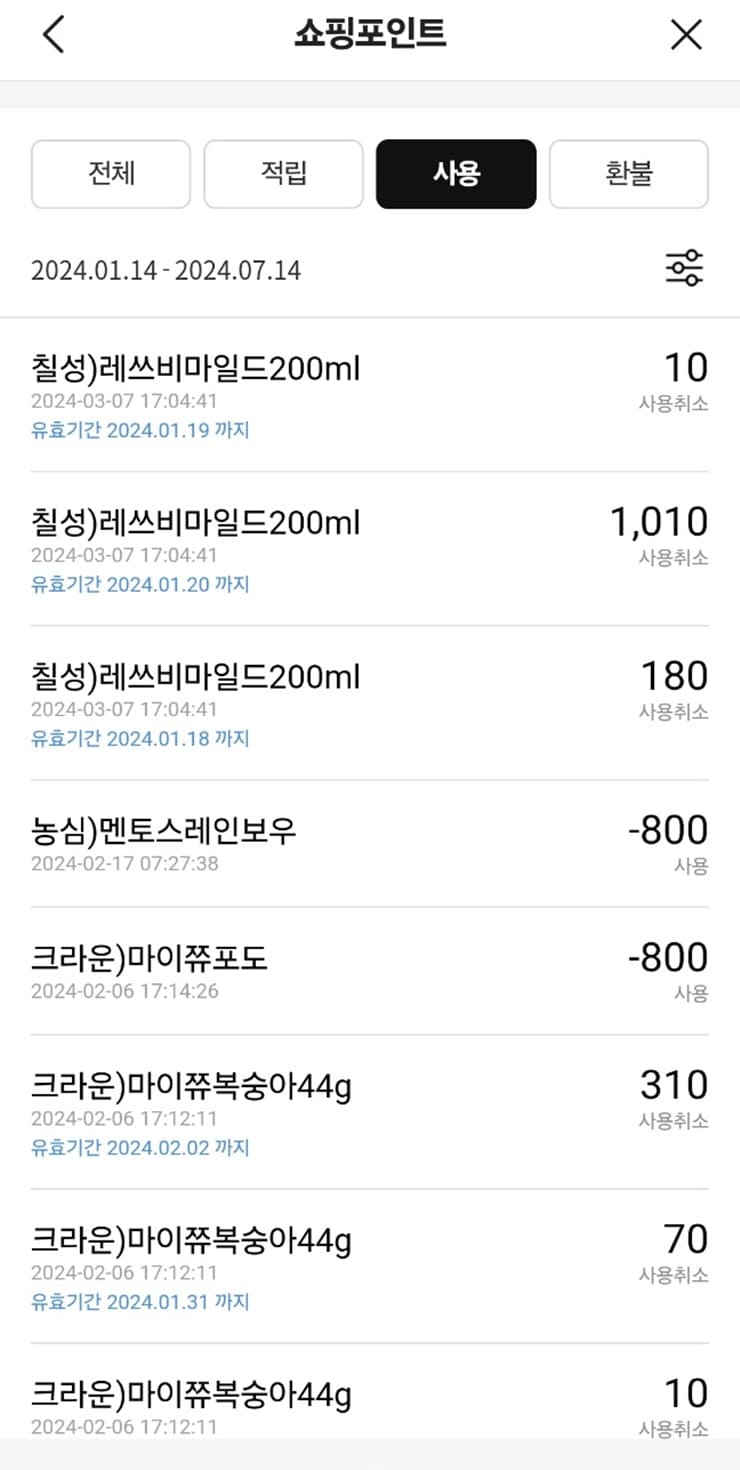 - 이벤트 쇼핑포인트 : 사용할 때 남아있던 유효기간만큼