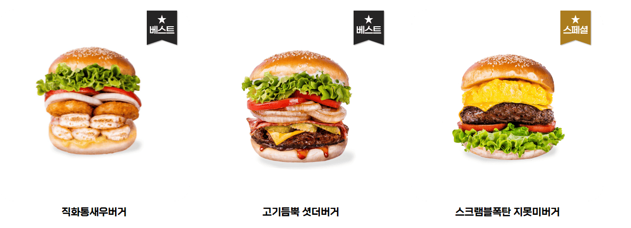 | 직화 통새우 버거 | 8,800 | 크런치 빵 + 와사마요 소스 + 새우링 + 통새우 + 토마토 + 양파 + 양상추 |