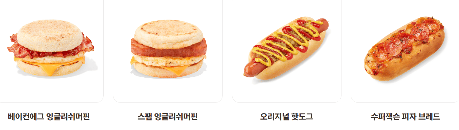 | 베이컨에그 잉글리쉬머핀 | 3,500 | 235 | 계란 + 베이컨 + 치즈 + 잉글리쉬머핀 |