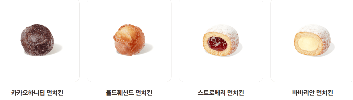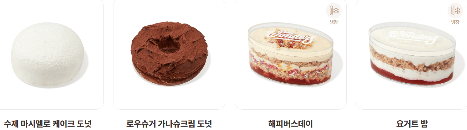 | 헤이즐넛 로쉐 | 3,900 | 285 | 초콜릿 도넛 + 헤이즐넛 분태 토핑 + 헤이즐넛 초코볼 |