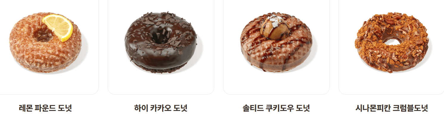 | 시나몬피칸 크럼블 도넛 | 4,500 | 665 | 시나몬 코팅 + 시나몬 쿠키 + 피칸 크럼블 |