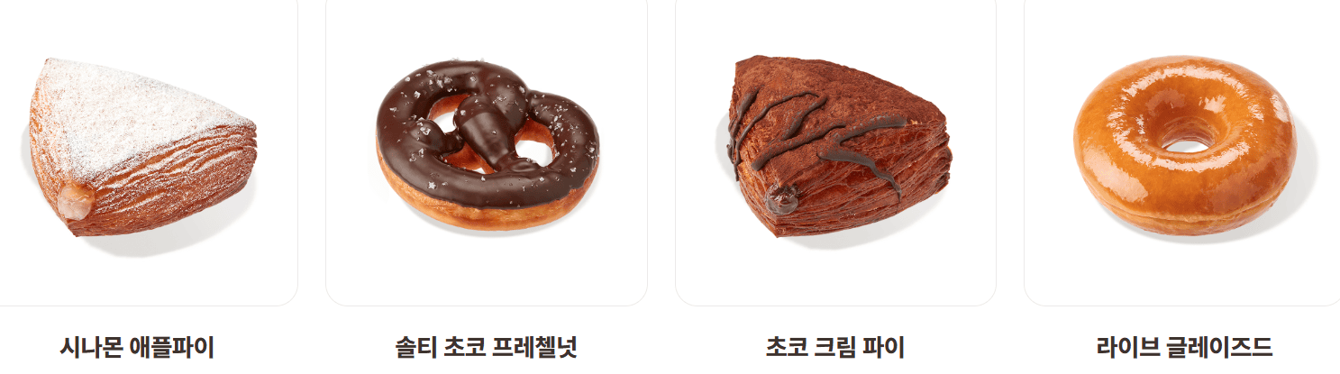 | 바닐라 피칸 크로스트 | 4,300 | 465 | 크로아상 + 파이도넛 + 바닐라 글레이즈드 + 피칸 |
