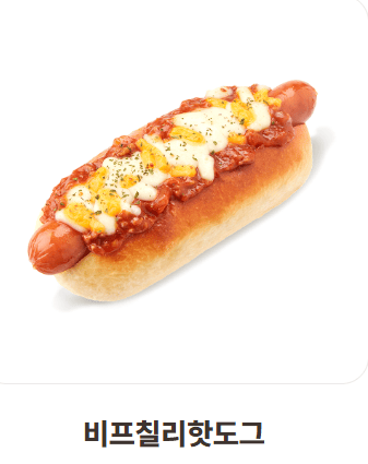 | 비프칠리핫도그 | 3,900 | 355 | 소프트 핫도그 번 + 비프칠리소스 + 소시지 + 체다치즈 |
