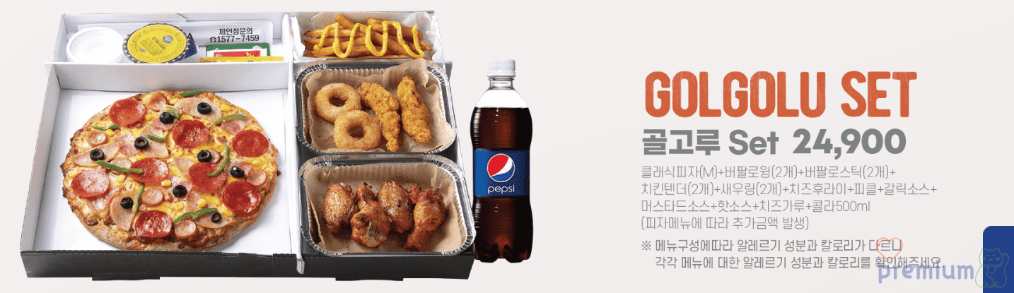 | 골고루 | 24,900 | 클래식 피자 M + 버팔로윙 2 + 버팔로스틱 2 + 치킨텐더 2 + 새우링 2 + 치즈후라이 + 콜라 |