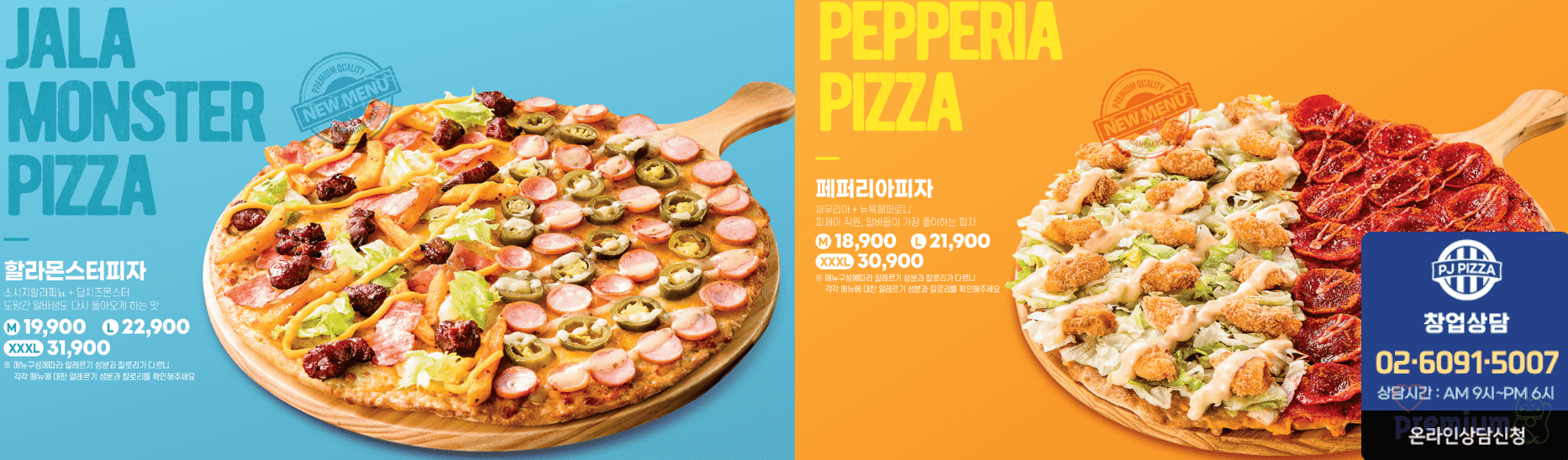 안녕하세요. 다양한 정보를 소개해주는 프리미엄IT입니다. 오늘은 피제이피자 메뉴와 가격, 칼로리 정보에 대해서 알려드리고자 합니다. 피제이피자는 골라먹을 수 있는 신개념 피자 프랜차이즈입니다. 피제이피자는 2006년 서울시 양천구 신월동에서 6평 작은 매장으로 시작하였다고 합니다. 맛에 대한 확신, 끊임없는 노력과 열정으로 연매출 15억이라는 기적을 만들어냈고 골라 먹는 피자라는 컨셉으로 고객들의 입맛을 사로잡았다고 합니다. 피제이피자는 23가지 피자 메뉴가 있습니다. 드시고 싶은 2가지 메뉴인 '일타쌍피'와 L 사이즈인 5가지 메뉴인 '오감만족'이 있습니다. 일타쌍피는 피자 메뉴에 따라 추가 비용이 발생되지만 오감만족은 모든 피자에 추가 비용이 없습니다. 그래서 다양한 피자를 맛보고 싶으시다면 '일타쌍피' 또는 '오감만족' 메뉴 중 드셔 보시길 바랍니다. 혹시라도 피제이피자를 드시고 싶으신 분들은 메뉴와 가격을 참고하시길 바랍니다. 단, 매장마다 다소 가격 차이가 날 수 있습니다.