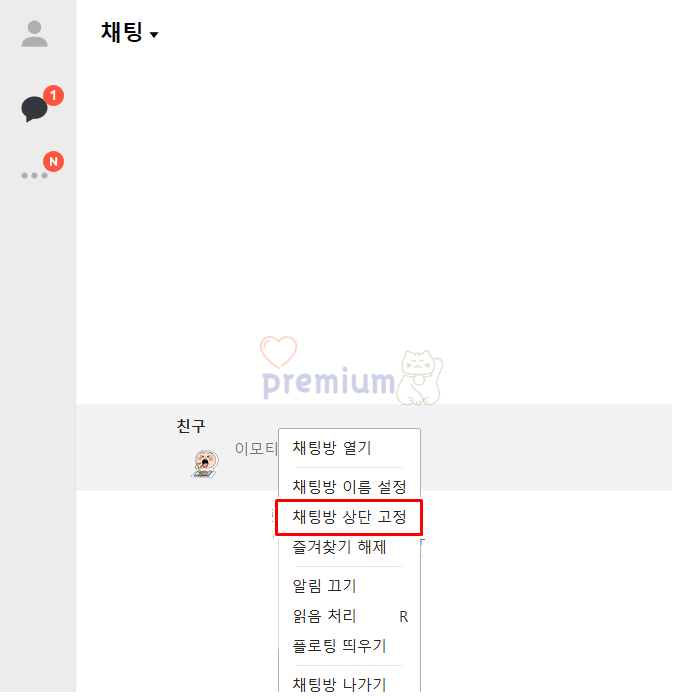 2. 상단 고정하고 싶은 채팅방을 우측 버튼으로 클릭합니다.