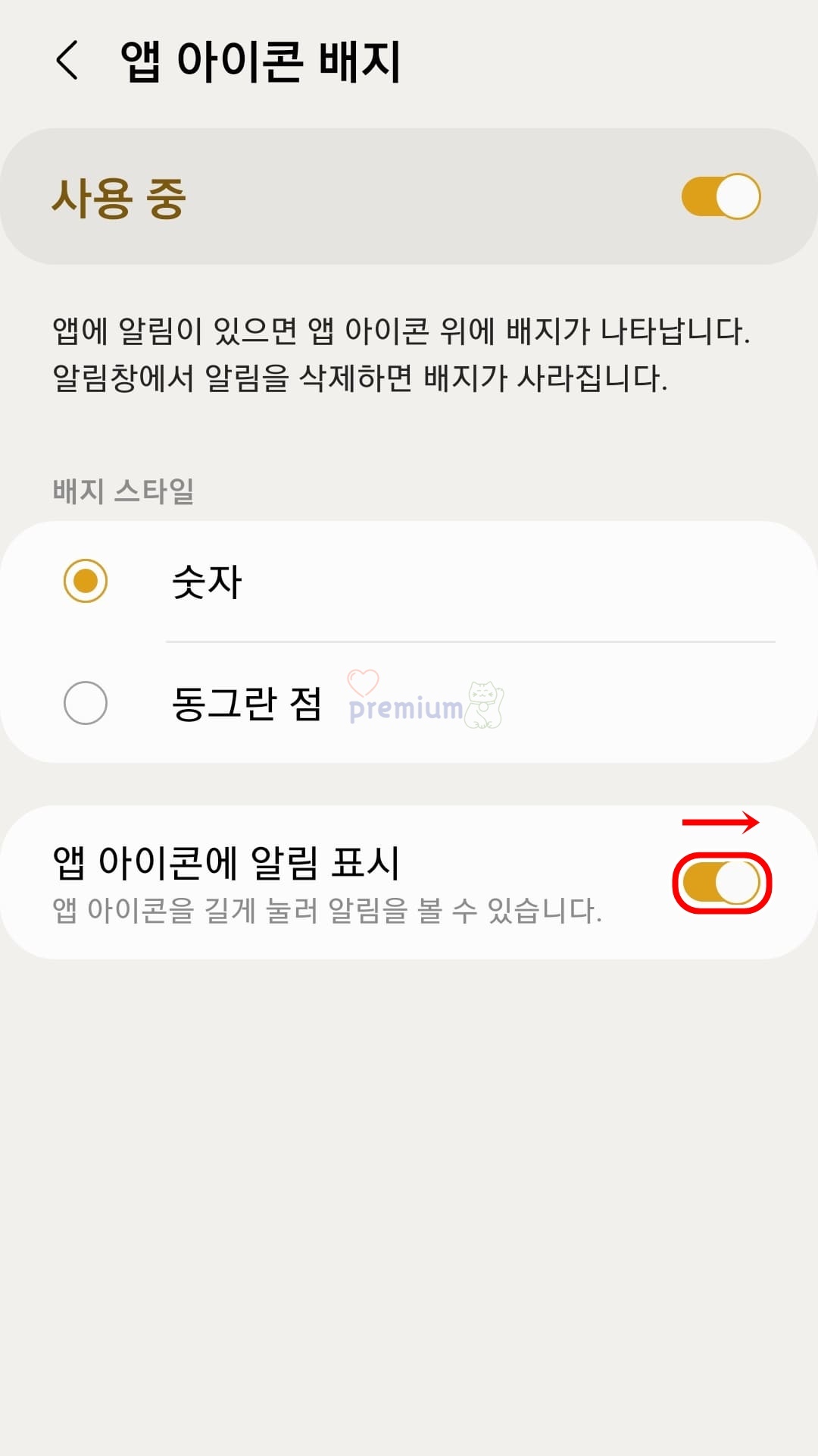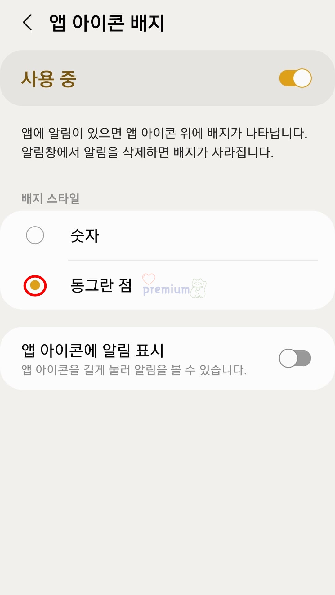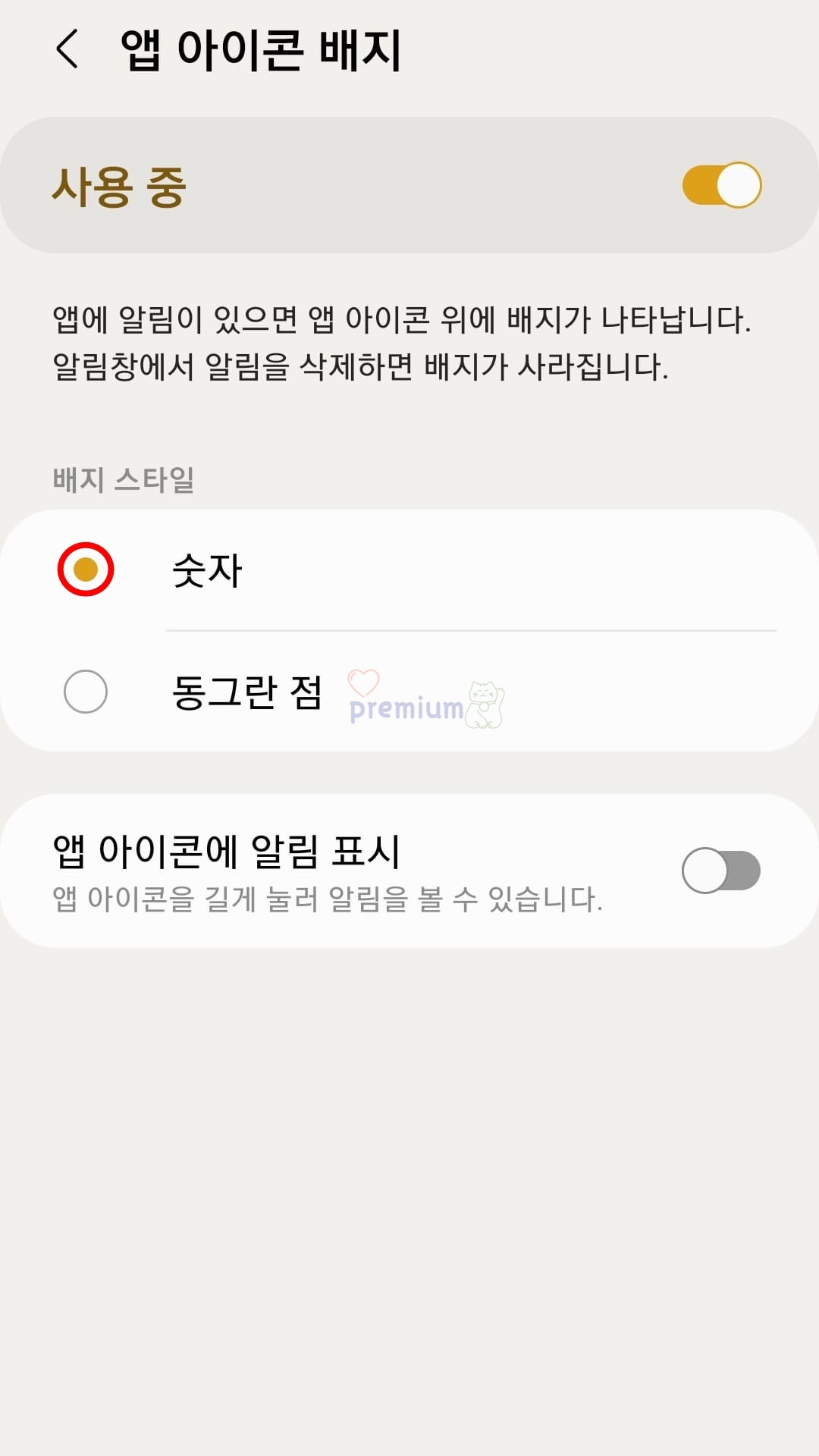 앱 아이콘 배지는 앱에 알림이 있으면 앱 아이콘 위에 배지가 나타납니다. 배지 스타일은 숫자와 동그란 점이 있으며 원하시는 스타일을 선택하시면 됩니다.