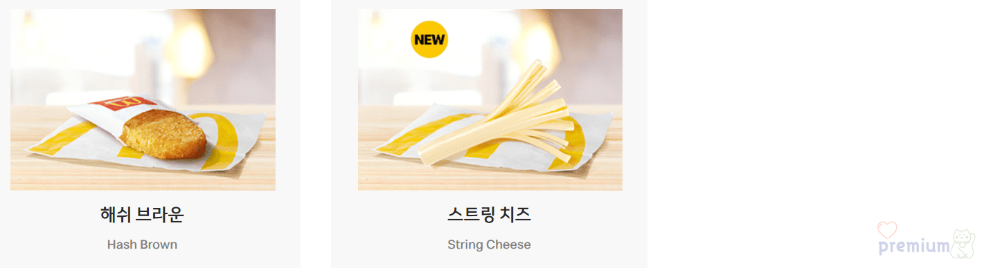 | 소시지 에그 맥머핀 | 3,000원 | 450kcal | 잉글리쉬 머핀 + 치즈 + 계란 + 촉촉한 소시지 패티 |